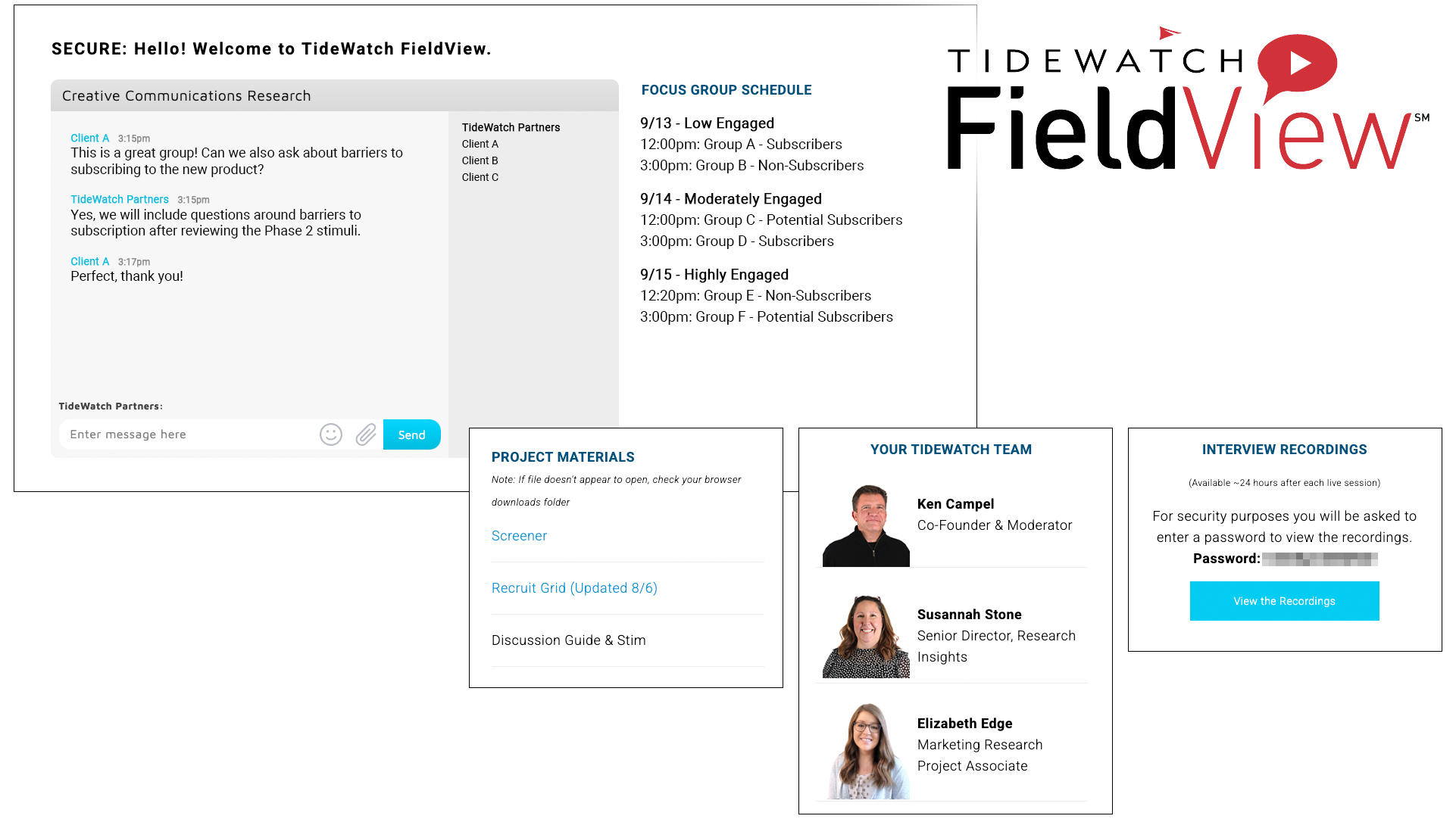 Our FieldView service keeps stakeholders connected to the research throughout the fieldwork and beyond, with a secure, password protected online environment. With a live chat, document archive, project calendar and more, we provide everything you would have in an in-person focus group/interview in one convenient interface, accessible from anywhere.